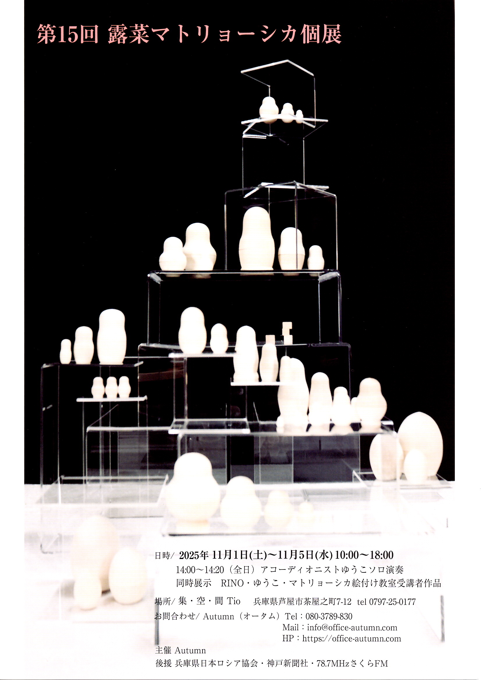 第15回露菜マトリョーシカ個展、無事に終了させていただきました。 ご来場いただきました皆様、本当にありがとうございました。 今後とも努力してまいりたいと思っております。 |